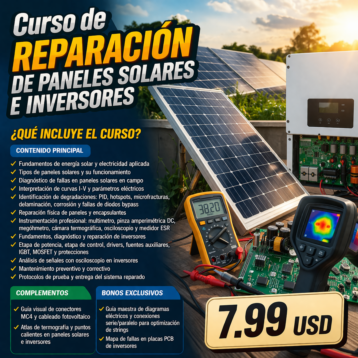 Este curso ha sido desarrollado para brindarte una formación técnica completa en diagnóstico, medición, análisis y reparación de paneles solares e inversores. Abarca desde los fundamentos eléctricos esenciales hasta los procedimientos más avanzados que se aplican en campo y laboratorio. No importa si estás comenzando en el área o si ya tienes experiencia como técnico eléctrico: el contenido está estructurado para que puedas avanzar paso a paso con claridad y precisión.
